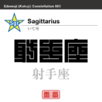 2023年7月25日 / 最終更新日時 : 2024年1月26日 zenzoadmin 角字で星座 射手座 いて座 角字で星座の名前、漢字表記 射手座 いて座 角字で星座の名前、漢字表記 星座の名前(漢字表記)を角字で表現してみました。該当する星座についても簡単に解説しています。